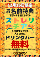 <12/16限り>お名前に「ストレリチア」が含まれている方はドリンクバーが無料!