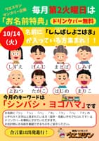 <10/14限り>お名前に「しんばし よこはま」が含まれている方はドリンクバーが無料!