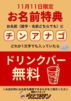 <11/11限り>お名前に「チンアナゴ」が含まれている方はドリンクバーが無料!
